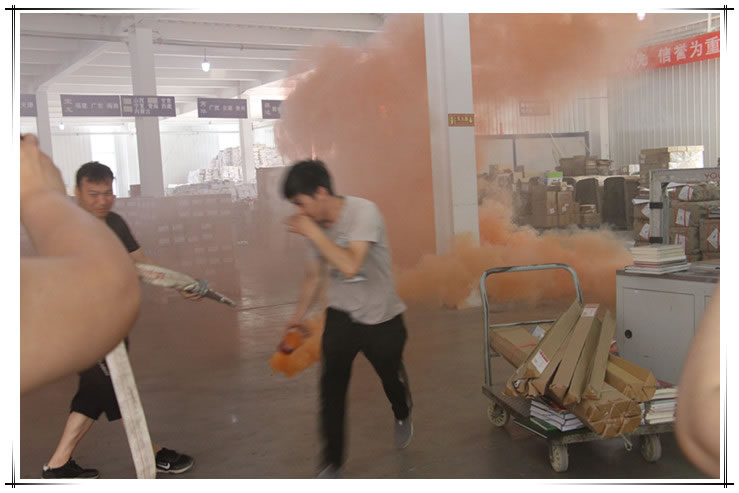 上午10點(diǎn)30分,一股濃煙從庫(kù)房?jī)?nèi)驟然冒起,隨著急促的火警鈴聲響起,疏散逃生消防演練正式開(kāi)始,庫(kù)房各崗位工作人員立即停止手頭的工作,捂住口鼻,彎腰前進(jìn),逃離“火場(chǎng)”,迅速有秩地前往安全地帶撤離。與此同時(shí),庫(kù)房相關(guān)負(fù)責(zé)人員撥打消防報(bào)警電話,等待消防隊(duì)的到來(lái)。經(jīng)過(guò)幾分鐘的等待,消防車(chē)緊急開(kāi)動(dòng)至庫(kù)房處,進(jìn)行出水救火模擬演練。最后,庫(kù)房全體員工集合完畢,安全“脫險(xiǎn)”。