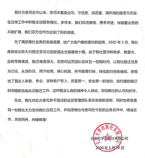 近日,昌達(dá)集團(tuán)又傳來喜報,北京大學(xué)出版社已完成新庫房搬遷工作,正式入駐昌達(dá)集團(tuán)倉儲基地,同時北京理工大學(xué)出版社與昌達(dá)集團(tuán)戰(zhàn)略合作再升級,由原來的倉儲業(yè)務(wù)升級為全面托管業(yè)務(wù)。兩大出版社的深度合作,助力昌達(dá)集團(tuán)業(yè)務(wù)發(fā)展再上新臺階。