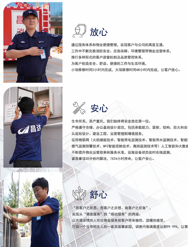 生命所系,資產(chǎn)重托,我們始終將安全放在第一位。嚴(yán)格遵守倉(cāng)儲(chǔ)、辦公基地設(shè)計(jì)規(guī)范,包括承載能力、面積、結(jié)構(gòu)、防火和安全措施;從規(guī)劃設(shè)計(jì)、建設(shè)工程、運(yùn)營(yíng)管理到增值服務(wù),運(yùn)用物聯(lián)網(wǎng)(火焰捕捉技術(shù)、智能用電監(jiān)測(cè)技術(shù)、智能用水監(jiān)測(cè)技術(shù)、智能獨(dú)立煙感監(jiān)測(cè)技術(shù)、燃?xì)獗O(jiān)測(cè)預(yù)警技術(shù)、NFC智能巡檢技術(shù)、離崗監(jiān)測(cè)技術(shù)等)人工智能和大數(shù)據(jù)技術(shù),不斷提升物業(yè)運(yùn)營(yíng)效率和服務(wù)水準(zhǔn),設(shè)施設(shè)備狀態(tài)實(shí)時(shí)在線監(jiān)測(cè),緊急事項(xiàng)30分鐘內(nèi)解決,7*24小時(shí)待命,讓客戶安心。